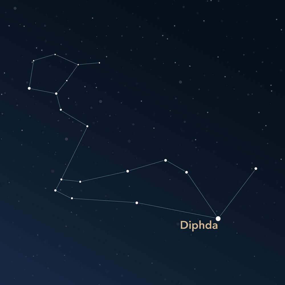 However, the Cetus is not particularly conspicuous. In its area, mostly faint stars can be found, with only two having an apparent magnitude brighter than 3. The brightest star is β Ceti (Beta Ceti), also known as Diphda or Deneb Kaitos. It is an orange giant star located approximately 100 light-years from earth, with an apparent magnitude of roughly 2.04 mag.
