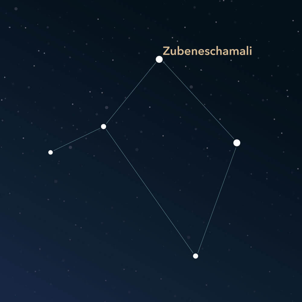 The stars are not particularly bright. Only two stars have an apparent magnitude brighter than 3. The most shining star is named Zubeneschamali (Latin: β Librae, Beta Librae), which comes from Arabic and means "the northern claw." It is a green shining star about 185 light-years from earth. Its apparent brightness is roughly 2.6.