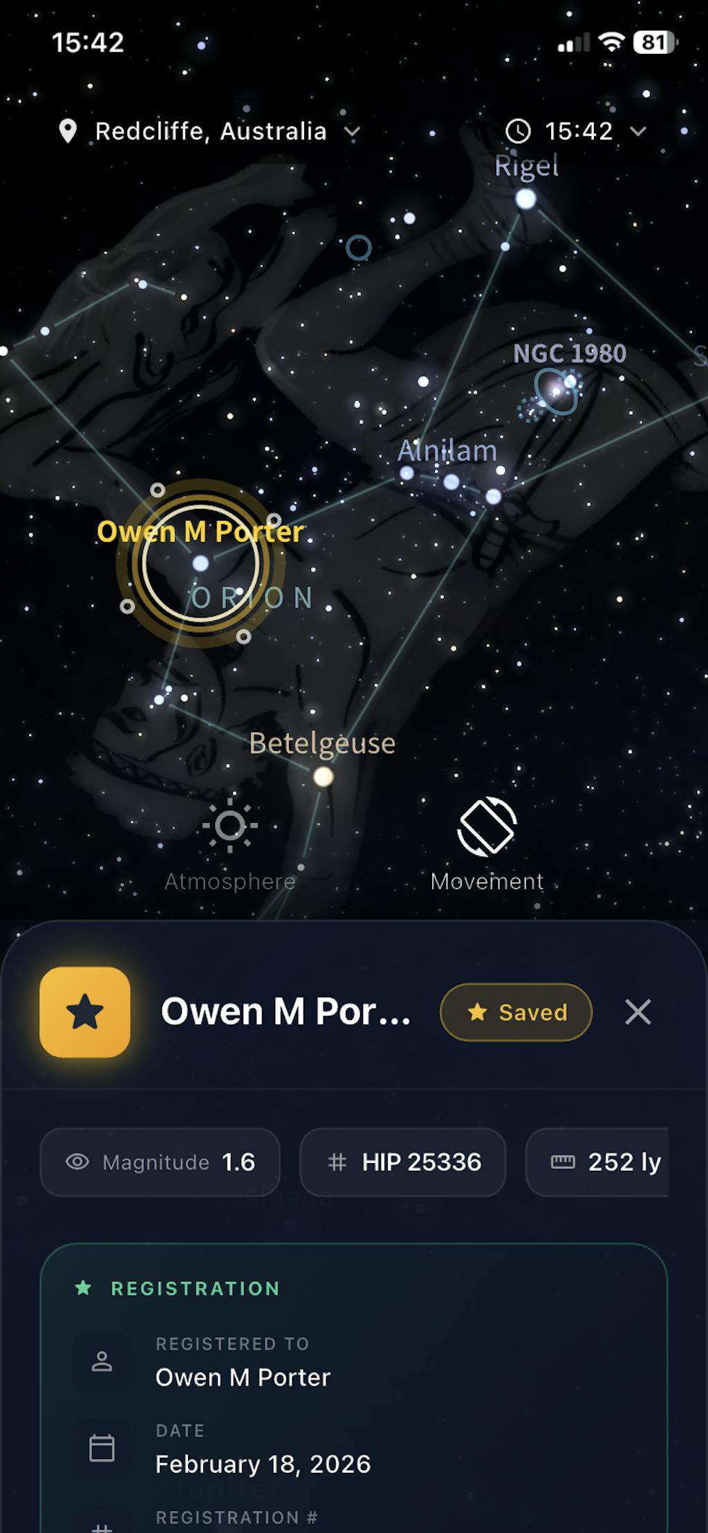 This was a birthday gift for my niece. She turned 60. She was very surprised and very happy to get her own star.