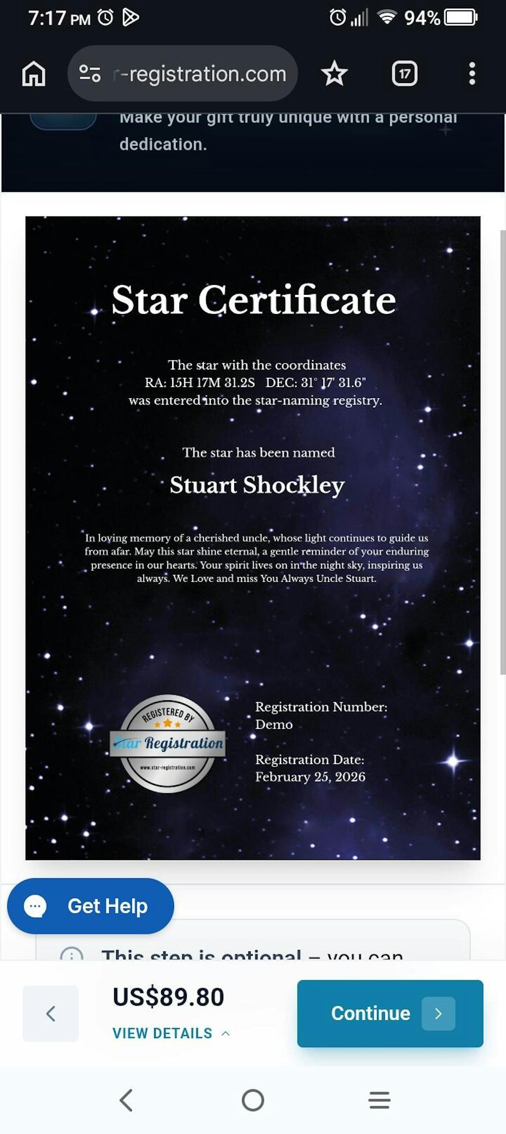 My aunt loves the memorial star. I purchased it for my uncle that passed away September 9, 2025. It was a surprise for her and my two cousins.